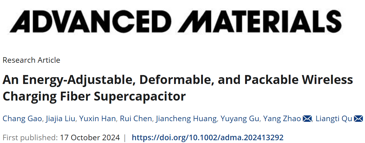 近日,bob手机在线登陆化学与化工学院博士生高畅和硕士生刘佳佳以共同第一作者在国际顶级期刊《Advanced Materials》(IF: 32)发表题目为“An Energy-Adjustable, Deformable, and Packable Wireless Charging Fiber Supercapacitor”的研究论文(DOI:10.1002/adma.202413292)。bob手机在线登陆为论文的第一通讯单位,化学与化工学院赵扬特别研究员和清华大学曲良体教授为共同通讯作者。