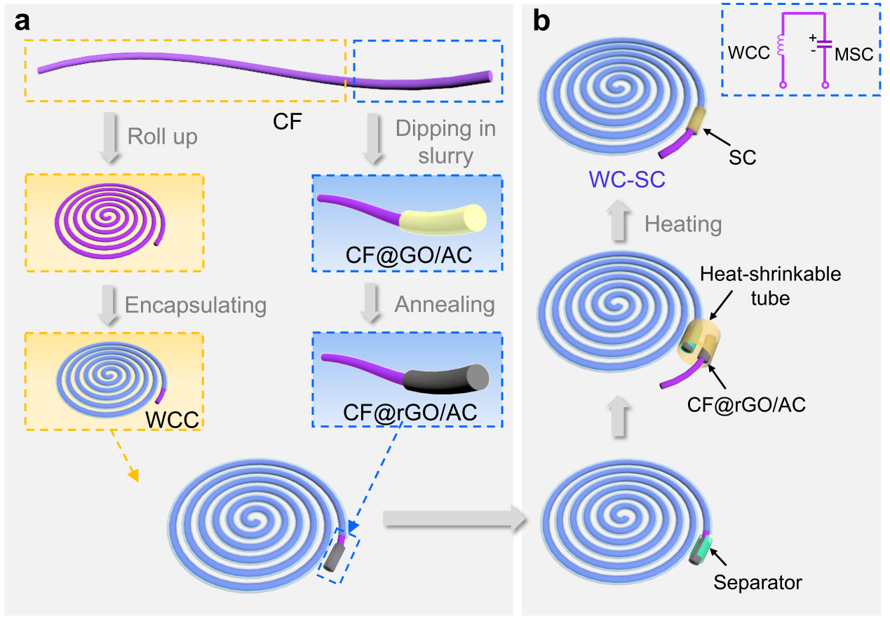WC-SC是基于一根柔性碳纤维(CF)制备的,其总长度为64 cm。如图1a所示,CF的一端作为WCC,另一端作为SC电极的支撑和集流体。对于WCC部分,CF的一端用绝缘双面胶覆盖,赋予其形状固定能力(图1a,左图)。而SC电极是将CF的另一端浸渍到氧化石墨烯(GO)和活性炭(AC)浆料(图1a,右图)的混合物中(浸渍电极长度为1.5 ~ 8.0 cm),然后在空气中干燥并在高温下加热,从而得到CF@rGO/AC复合材料。为了获得完整的SC,依次组装了一块滤纸隔膜和另一个相同的CF@rGO/AC电极(图1b),然后滴加离子液体电解质并用热缩管包裹。图1b插图中WC-SC的电路图对应无线充电部分(如WCC)和储能部分(如MSC)。