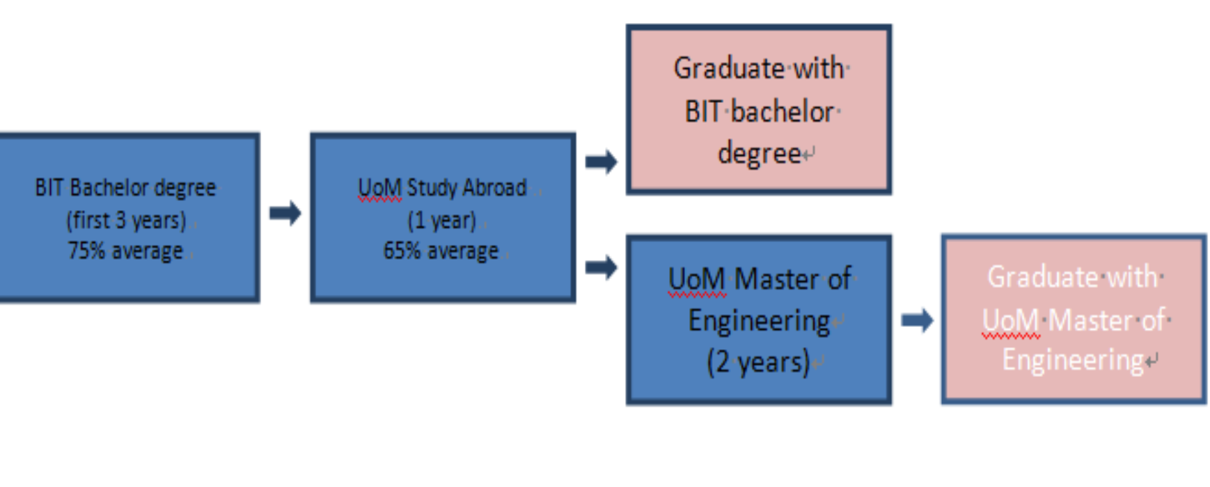 2017年起我校与墨尔本大学合作开展访学项目。参加该项目的学生,大学前三年在我校学习,第四年赴该校学习。按照我校专业学院要求完成国外学习任务的学生,可获得我校相应学分。成绩合格者可获得我校毕业证书和学士学位证书。在墨尔本大学第一学年平均成绩达到65%以上的学生可以申请继续攻读该校工程硕士学位。项目学习流程如下图: