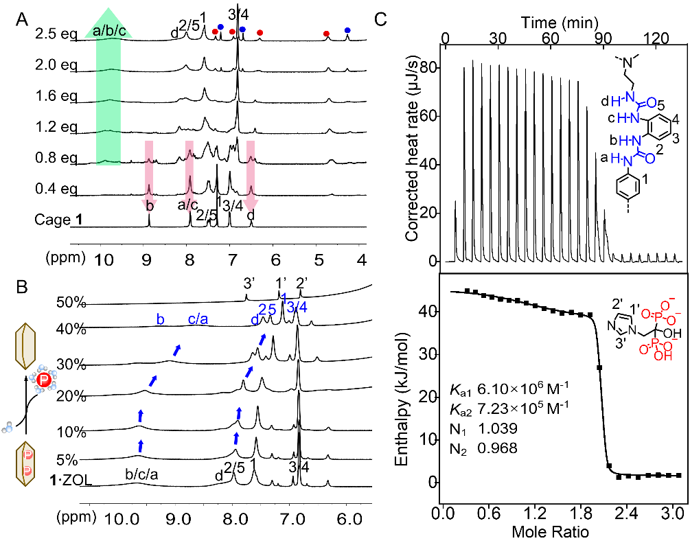 以硫酸根离子为模板,三足三脲前体与1,4-亚苯基二异氰酸酯通过一锅法反应合成十二脲分子笼(cage1)。单晶分析表明,cage1与不同PDs以1:2结合(图1B),每个阴离子通过多重氢键稳定结合于六脲单元内。笼状结构的轴向高度及中间苯环形成的空腔可动态调整以适配不同尺寸阴离子。核磁共振(NMR)滴定分析显示(图2A),连续滴定PDs导致cage1的NH质子产生显著低场位移,伴随复合物特征峰的出现,证明PDs与cage1在NMR时间尺度下存在慢交换热力学结合机制。溶剂极性效应实验证实,水含量的梯度增加(从0.5%增加至20%(H2O/DMSO-d6))显著削弱配合物主客体间的氢键相互作用(图2B),导致cage1与PDs的结合常数呈现数量级递减:从106M−1降至104M−1。由此推演,纯水溶液中cage1与PDs的结合常数将显著降低(<<10<>4M−1),再次验证cage1在水环境中能够高效释放PDs。等温滴定量热法(ITC)测得的复合物1⋅PD的结合常数Ka1为106~ 107M−1(图2C),与磷酸盐转运蛋白(Ka= 106M−1)相当,且不同PD底物间的结合常数差异极小,同样表明cage1具有自适应阴离子结合特性。