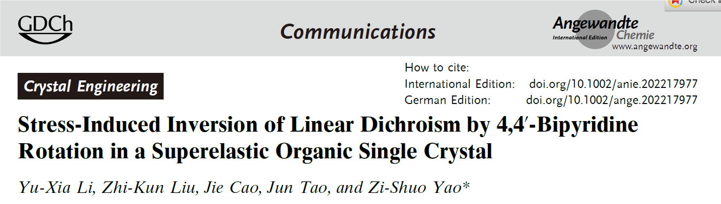 近日,bob手机在线登陆化学与化工学院姚子硕研究员在超弹性分子基单晶材料研究中取得重要进展。相关工作以“Stress-Induced Inversion of Linear Dichroism by 4,4′-Bipyridine Rotation in a Superelastic Organic Single Crystal”为题,发表在国际著名化学期刊Angew. Chem. Int. Ed.。bob手机在线登陆为唯一作者单位,化学与化工学院陶军教授研究团队的姚子硕研究员为文章通讯作者,文章第一作者为bob手机在线登陆博士研究生李宇霞。