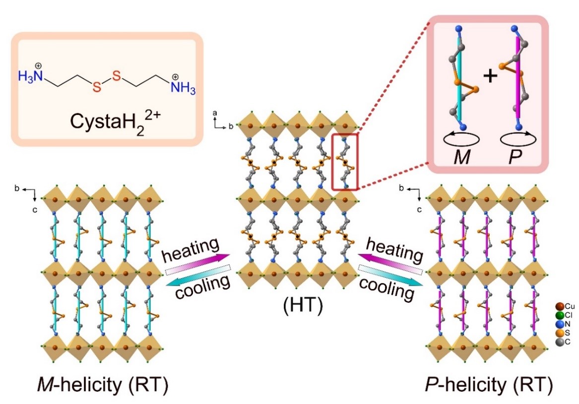 该研究团队在前期通过分子结构变化调控材料力、电、磁物理性质的基础上,(Nat. Commun.2019,10, 4805;CCS Chem.2021, 2, 2464–2472;Nat. Commun.2021,12, 6908;Nat. Commun.2021,13, 3510),利用胱胺有机阳离子具有显著结构柔性且在结晶过程易于形成螺旋手性构型的特点,合成胱胺四氯合铜(II)二维钙钛矿型晶体。利用胱胺阳离子中间‒C‒S‒S‒C‒结构片段螺旋取向与分子电偶极矩的结构关联,通过电场控制该结构片段取向变化,首次实现了电场控制晶态分子的P-M螺旋手性以及铁电自发极化的协同反转。铁电性质与手性调控的耦合,不仅为外部刺激控制材料手性提供了研究思路,同时有望应用于开发新型手性电子器件。