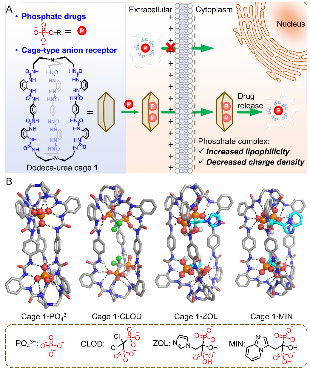 磷/膦酸基团是抗病毒、抗肿瘤及抗骨质疏松药物的关键活性基团,然而其高亲水性和多重负电荷特性严重阻碍该类药物的跨膜转运,导致生物利用度低(例如,临床使用的双膦酸盐的生物利用度仅为1%)。为提高磷/膦酸盐药物(PDs)疗效并减少其副作用,现有策略包括:(1)小分子酯化修饰,以增强亲脂性,但需要对药物分子逐一进行修饰;(2)纳米颗粒载体,虽具广泛的药物适应性,却存在载药量批次间差异大的问题而导致临床应用受限制。针对上述科学问题,亟待开发可通过明确结构实现明确的药物负载且具有广谱药物适应性的载体。单分子载体凭借分子级精准封装能力成为新兴解决方案。然而,具有水合能高、几何形状复杂的磷/膦酸药物与载体间有效结合是极具挑战性的。目前的研究仅有两例阳离子型环糊精衍生物作为分子载体通过静电作用结合三磷酸盐实现细胞水平的递送(Sci. Rep.2017, 7, 8353.;Angew. Chem. Int. Ed.2018, 57, 9891-9895.)。