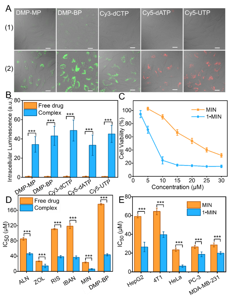 为评估cage1对PDs的递送效果,本研究首先测试了cage1对多种肿瘤细胞(如HeLa、HepG2、MDA-MB-231、PC-3和 4T1)的细胞毒性,即使在100 µM条件下,细胞存活率仍显著高于安全阈值,凸显其优异的生物相容性。本研究首先采用荧光标记的单磷酸盐、双膦酸盐(BPs)及三磷酸盐作为模型药物,通过共聚焦显微镜直观展示了复合物的胞内积累效果。结果显示,cage1žPDs复合物处理的细胞其荧光强度较游离药物组显著增强了33~45倍(图3A, 3B),文献中带正电荷的环糊精递送的PD在MCF7细胞中的荧光强度只提高了5倍。抗肿瘤细胞增殖实验进一步证明,相比起游离的双膦酸盐,cage1递送的双膦酸盐对肿瘤细胞对肿瘤细胞的增殖抑制效率提升2-4倍(图3C, 3D),且该效果在多种细胞系中均保持一致(图3E)。相较于与原药酯化(提高1.3倍)或非靶向单功能双膦酸盐纳米载体(效果忽略不计),cage1展现更优越的递送效率。cage1通过精准PD药物负载与可控释放,为改善磷/膦酸盐类药物的临床疗效提供了可靠依据。