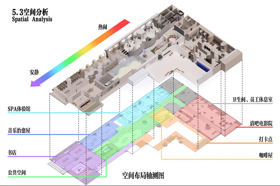 整体解压体验馆分为五个解压空间,各个空间通过与自然中的“风、雨、云、木..…“相结合,各自打造不同方式的解压空间:清吧主要通过向人倾诉、社交来做到压力的排解;咖啡屋主要通过低矮空间的设计,为人们提供一种“蜷缩”的安全感;音乐体验馆主要通过在个人空间内感受音乐的魅力进行压力的排解;书店主要考虑人群交流方式、解决社交恐惧等问题;体验馆主要通过在个人空间内进行冥想与按摩来排解压力。