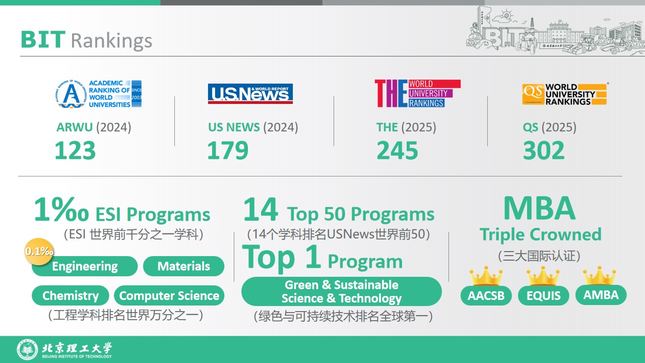 BIT is the Top 10 most challenging university for admission of science and engineering programs in China. BIT students have won consecutive championships and awards in innovation and entrepreneurship competitions both domestically and internationally, with the number and quality of awards ranking the top in China.