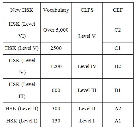 The different levels of the new HSK are similar to some of the levels in theChinese Language Proficiency Scales for Speakers of Other Languages (CLPS) and the Common European Framework of Reference (CEF); details are as follows:
