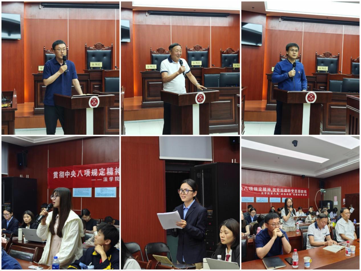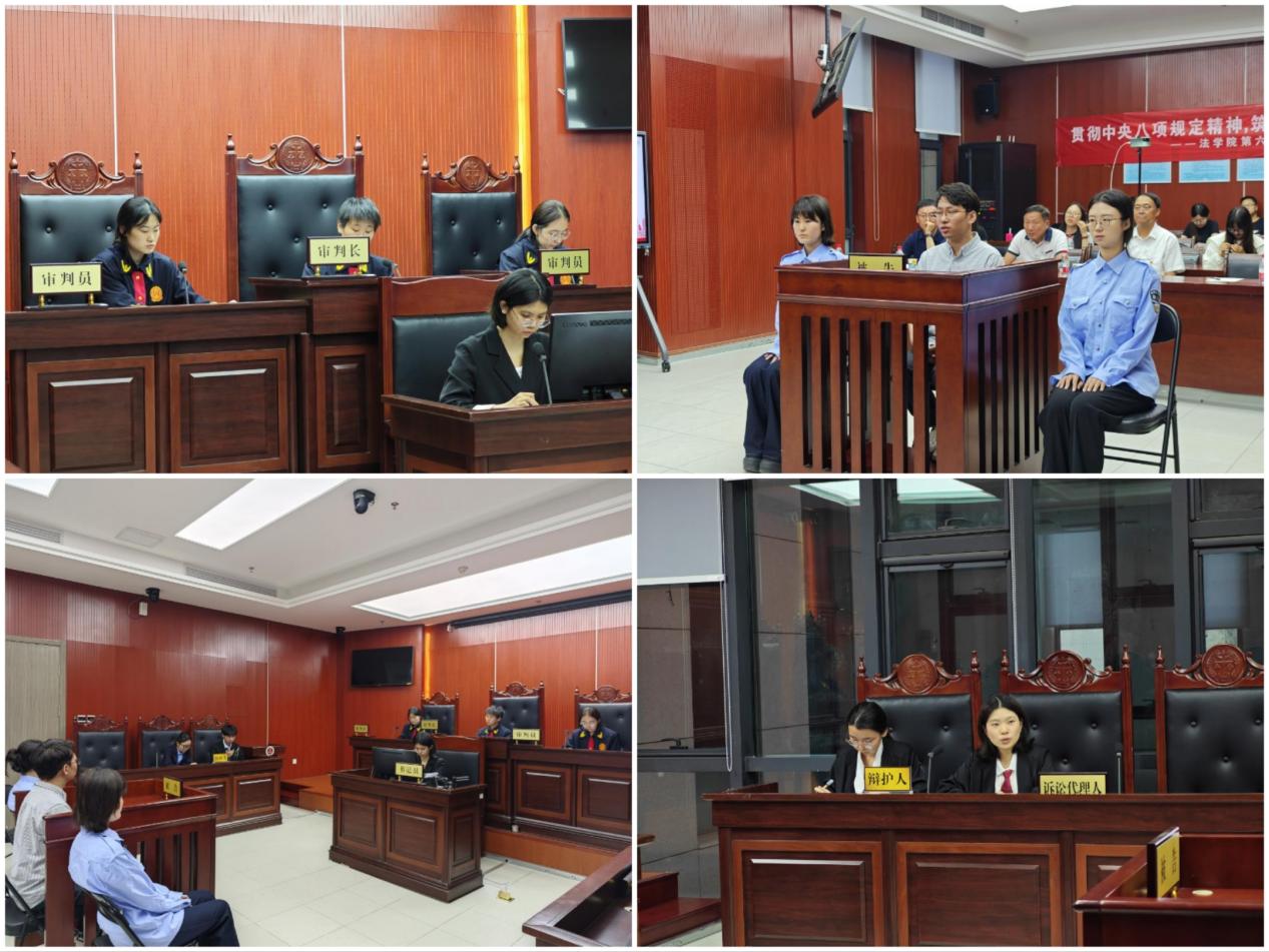 伴随着清脆的法槌声,模拟法庭环节正式开始。同学们认真演绎了“何发理受贿案”的庭审现场,控辩双方紧扣案件事实和法律规定展开激烈的辩论,充分展现了法学专业学生扎实的法学功底。通过对庭审活动的直观展示,与会同学更加深入地理解中央八项规定精神的丰富内涵和现实意义。