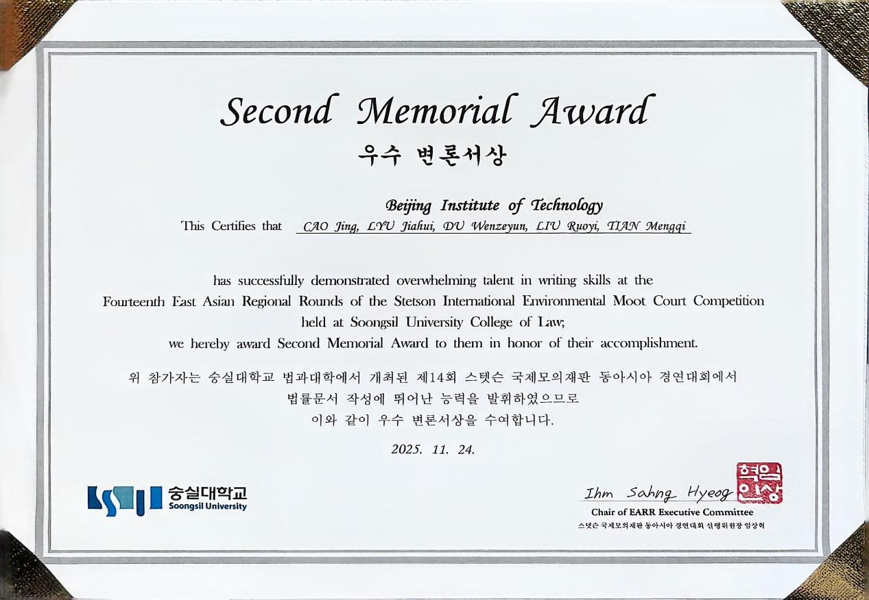 2025年11月20日-24日,第30届“史丹森”国际环境法模拟法庭大赛(Stetson International Environmental Moot Court Competition,IEMCC)东亚赛区选拔赛(East Asia Regional Round) 在韩国崇实大学(Soongsil University)举行。北理工法学院代表队在众多国际知名高校中脱颖而出,凭借逻辑清晰、质量优良、准备充足的书状荣获“最佳书状二等奖”。