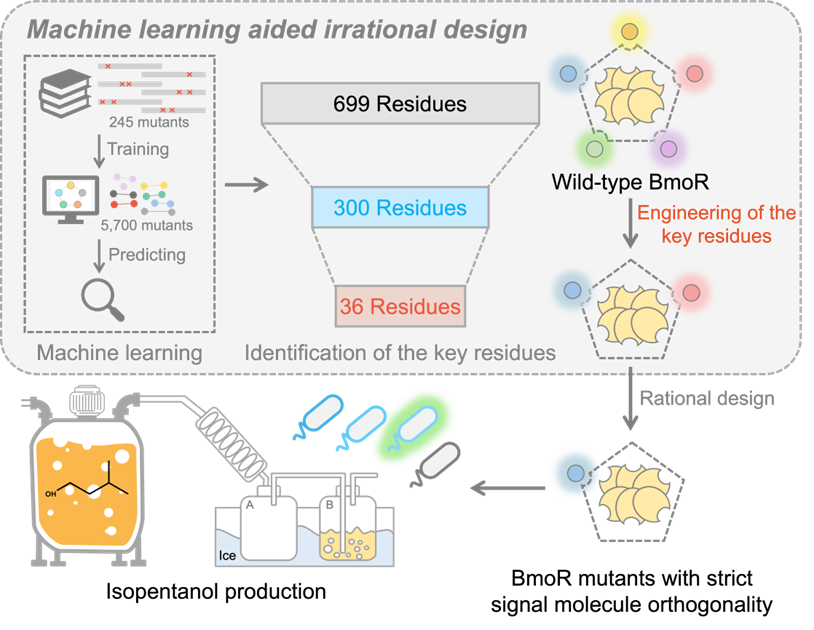 目前,转录因子(Transcription factor, TF)工程依赖于随机突变与高通量筛选相结合,而较大区域的突变会一定程度破坏转录因子的功能,同时一些非功能性的突变体的存在降低了有效突变体的筛选效率。将改造重心集中在控制信号分子正交性、灵敏度和检测范围的功能区域上,可以有效提高获得理想突变体的速率。基于此,识别这些关键区域对于高效设计高性能转录因子至关重要。人工智能推动了合成生物学和代谢工程的进步,特别是机器学习在蛋白质和酶工程中的应用。将高通量筛选与机器学习相结合,可以加速评估大量突变体性能的速度,从而显著减少实验的工作量和成本。基于此,本研究建立了基于机器学习的半理性设计策略,通过定位影响BmoR与信号分子结合的关键区域对BmoR进行半理性设计,实现BmoR对特定信号分子严格特异性响应(图1)。