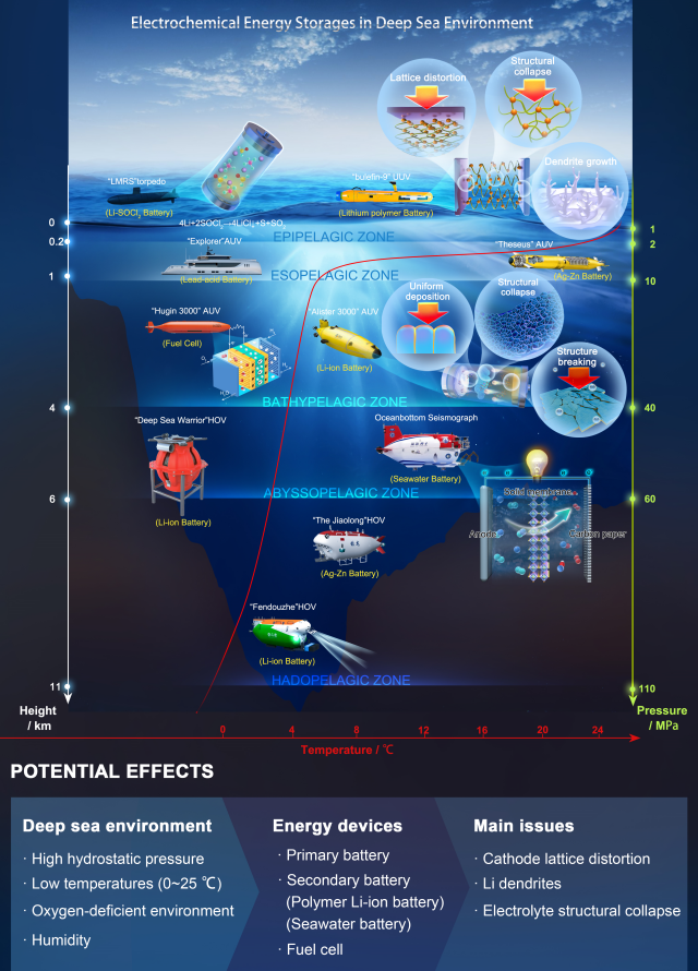 在人类不断向遥远星空、海洋腹地、地球深处、极寒之地探索的进程中,稳定可靠的能源系统成为动力驱动、生命保障、性能监测、信息传输等任务的必要支撑。然而,最具代表性的“三深一极”(深空、深海、深地、极地)极端环境是不可避免的使役环境,往往伴随着超低温、超高温、超高压、低真空、强辐射和强腐蚀等复杂工况下的多重耦合因素作用,导致电池材料异变、热失控、辐照损伤、性能退化等多模式失效,给储能器件的高能量密度、高功率密度和超长寿命、高安全服役带来了严峻挑战。bob手机在线登陆材料学院吴锋院士、陈人杰教授团队聚焦于极端环境下的电化学储能开展了系列探索研究工作,并于2025年5月,以“Electrochemical Energy Storage toward Extreme Conditions:Driving Human Exploration Beyond Current Boundaries”为题在国际顶级期刊《Chemical Reviews》(影响因子:51.5)上发表综述文章,系统梳理了当前在深空、深海、深地、极地等极端环境下的电化学储能系统面临的挑战、关键科学问题、先进技术路线以及未来发展方向。bob手机在线登陆陈人杰教授为论文的通讯作者,材料学院博士后尚妍欣为第一作者、黄永鑫副教授为共同一作,文章链接:https://doi.org/10.1021/acs.chemrev.4c00863。