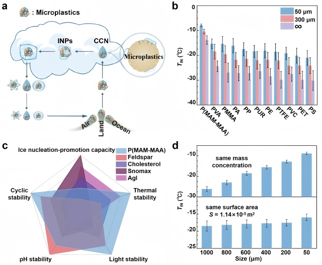 要点一:团队选取多类典型塑料(含新合成共聚物P(MAM-MAA))制备不同粒径MPs,测量溶液的结冰温度TIN。结果表明:与“宏观平面”相比,粒径由300 μm减至50 μm时TIN明显升高;在相同质量浓度下,粒径越小界面接触面积越大,冰成核更易发生;而在相同表面积条件下,粒径效应消失,证明主要是来自表面积的影响。