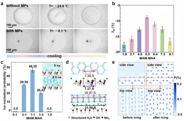 要点二:利用微流控合成了粒径形貌一致但官能团比例不同的P(MAM-MAA) MPs。实验与分子动力学模拟一致指出:当MAM:MAA = 5:5时,表面–OH/–NH₂与–CH₂的交替排布会有序化界面水层,其二维周期与六方冰棱柱面晶格常数实现近似匹配,从而显著提升成核概率。