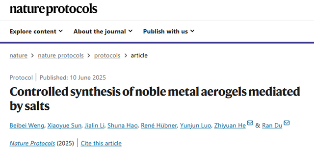 近日,bob手机在线登陆杜然教授团队和贺志远教授课题组合作,在金属气凝胶可控制备方面取得重要进展,相关成果以“Controlled synthesis of noble metal aerogels mediated by salts”为题在国际顶级期刊《Nat. Protoc.》发表(DOI: 10.1038/s41596-025-01185-1)。bob手机在线登陆材料学院2022级博士生翁蓓蓓为第一作者,杜然教授、贺志远教授为论文共同通讯作者。