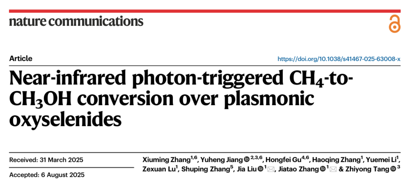 近日,bob手机在线登陆刘佳、张加涛教授团队与国家纳米中心唐智勇院士团队合作,在光催化甲烷室温转化领域取得重要进展,相关研究成果以“Near-infrared photon-triggered CH4-to-CH3OH conversion over plasmonic oxyselenides”为题在国际顶级期刊《Nature Communications》发表(DOI: 10.1038/s41467-025-63008-x)。这一研究成果为温和条件下的甲烷活化与利用提供了全新的光催化剂设计平台。bob手机在线登陆材料学院刘佳副教授,化学与化工学院张加涛教授为本论文共同通讯作者,博士研究生张修铭、蒋雨恒,谷鸿飞为共同第一作者。