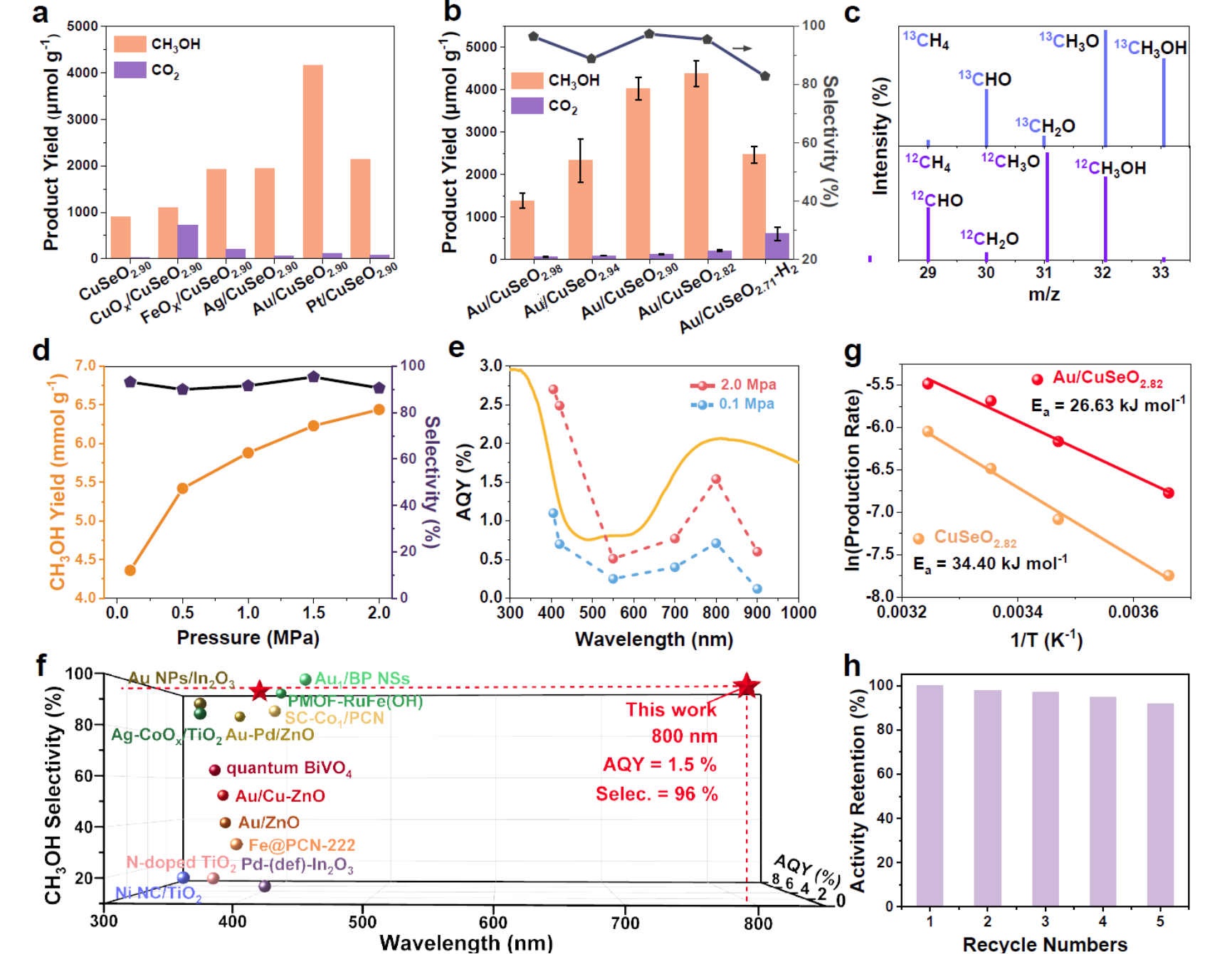负载Au纳米颗粒助催化剂后,Au/CuSeO2.82在常温常压下能够以O2分子为氧化剂,高效将甲烷氧化为甲醇,甲醇生成速率为4780 μmol g-1,选择性达95.3%。进一步提高反应压力可在2.0 MPa下将甲醇生成速率提高至6440 μmol g-1,选择性保持不变,反应活化能低至0.28 eV,在800 nm的AQY高达1.5%,表明Au/CuSeO2.82能够利用低能量的近红外光子有效活化惰性甲烷分子。