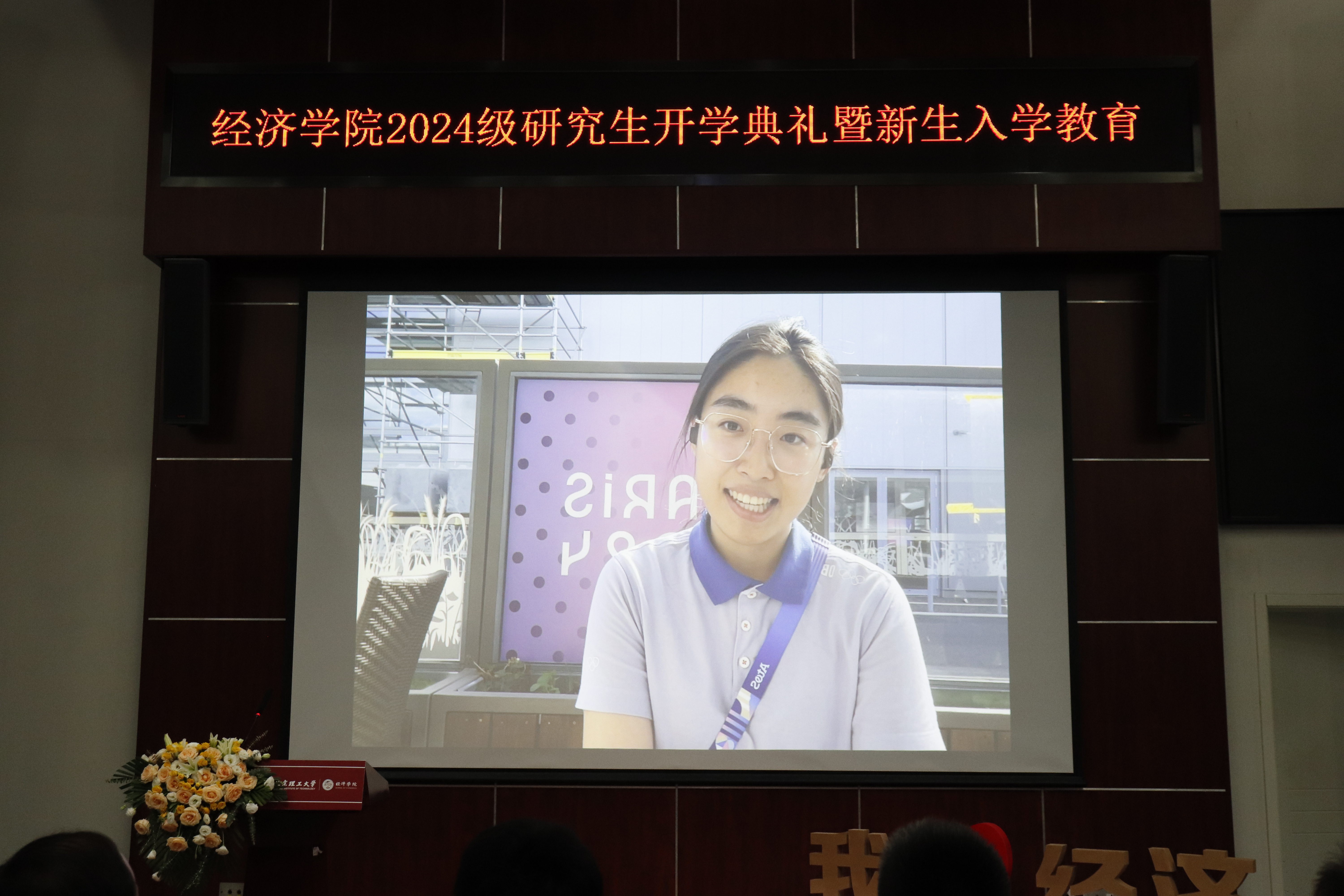 2024级硕士新生黄郁微作为新生代表发言。她以视频方式分享了自己在法国巴黎奥运会实习的经历,回顾了在北理的四年本科生活。黄郁微表示,因为有学校和学院平台支持,她才能从刚开始的迷茫无知,成长到如今的学有所成,在研究生阶段,更要充分发挥个人主观能动性,在学校和学院的支持下行稳致远,保持前进。