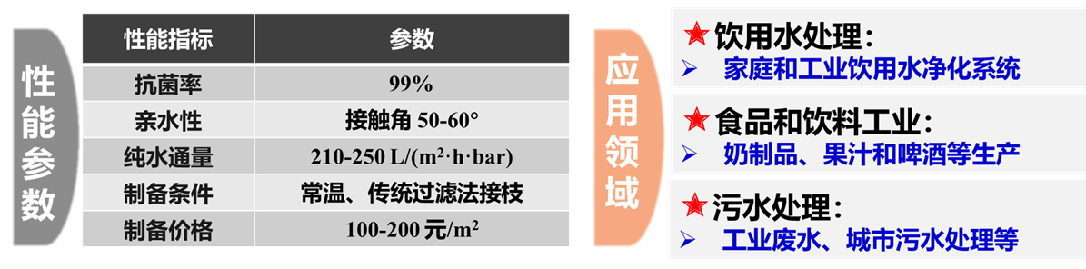 目前主流的抗菌膜制备方法是在基膜表面接枝抗菌物质,常用的抗菌材料包括氧化石墨烯、碳纳米管、抗菌聚合物、金属离子等,但这些材料普遍存在着接枝方式复杂,且对环境有危害的缺陷。相比而言,季铵盐类抗菌剂具有抗菌效果好,环境友好等特点,目前水溶性的小分子或高分子季铵盐抗菌剂已经广泛应用于水处理、食品、医疗卫生和包装材料等领域。然而,将季铵化合物直接接枝到膜表面所制备的抗菌膜仍存在制备流程复杂,成本较高等问题,这也使得目前开发的大部分季铵盐功能膜无法大规模应用于实际水处理系统。因此,为解决以上问题,开发新型亲水抗菌功膜的制备方法是目前业内所亟需的。