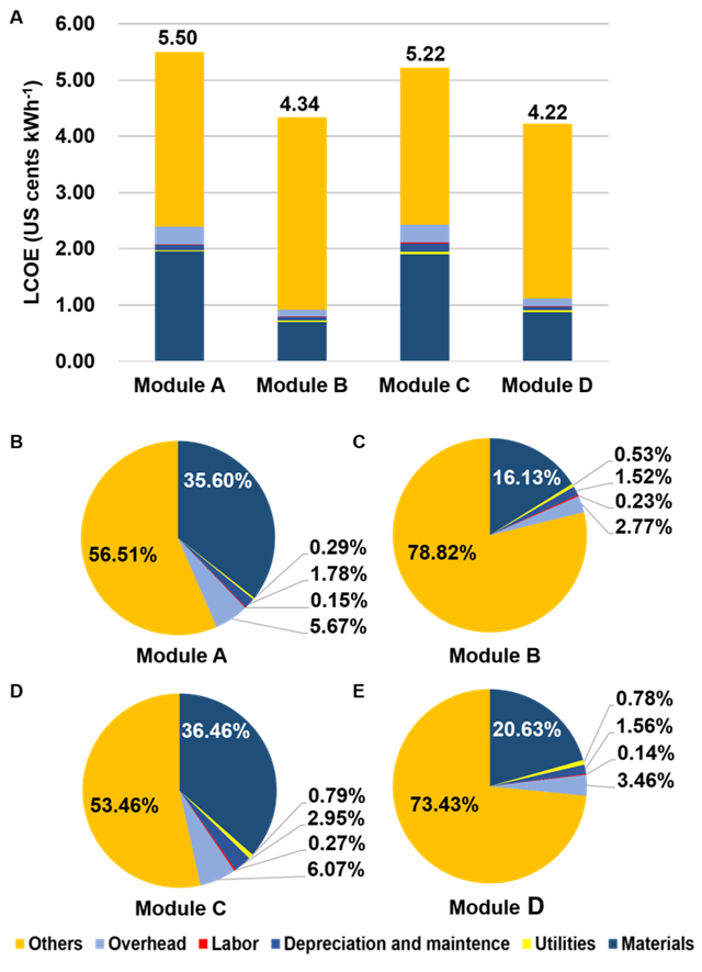 图2(A)为四种器件的LCOE(美分/千瓦时);(B-E)为四种器件的LCOE组成细分。