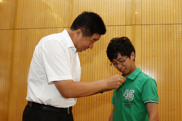 党委书记郭大成为冯玖江佩戴校友徽章,并发表讲话对冯玖江见义勇为的行为表示赞扬。