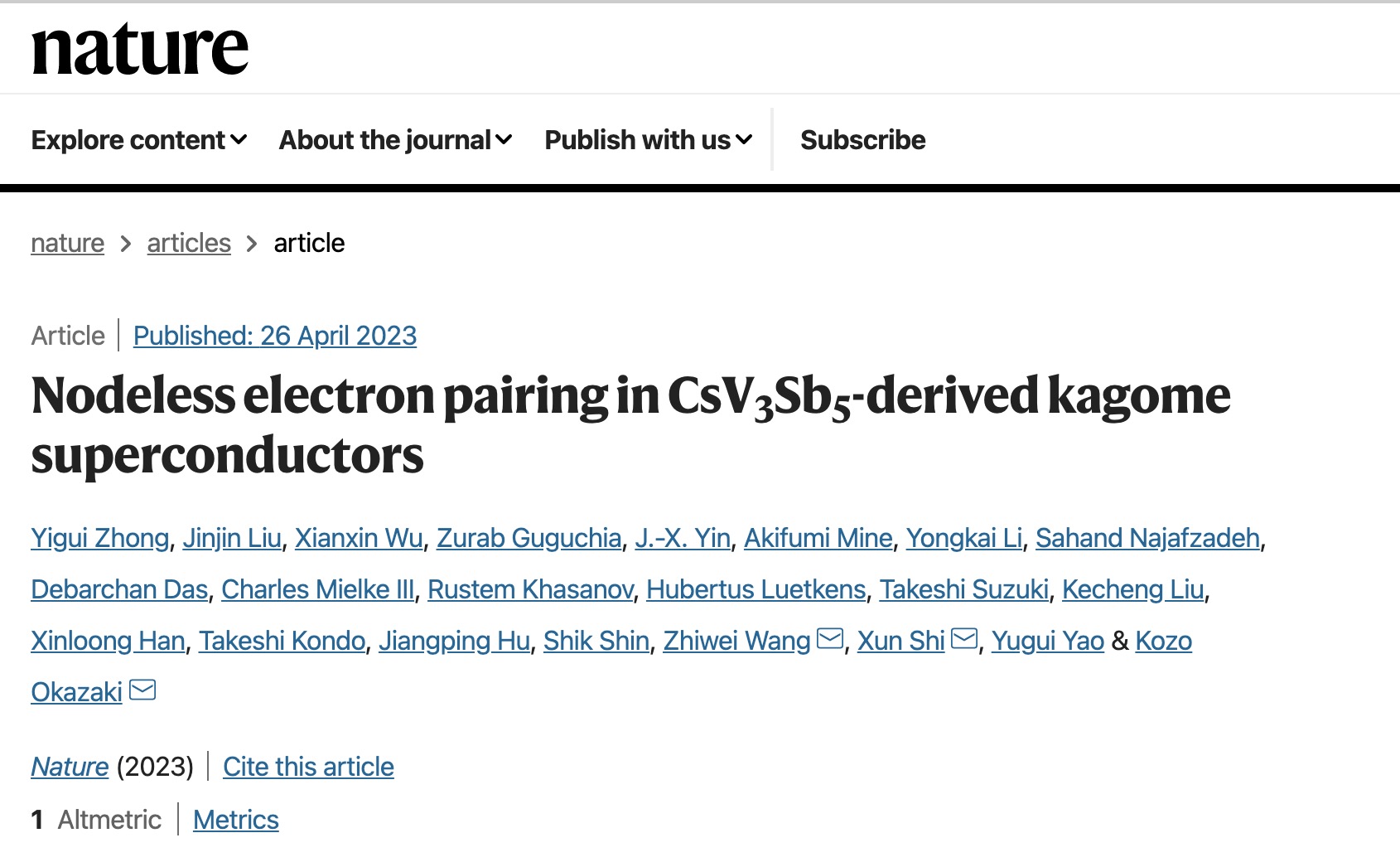 近日,bob手机在线登陆物理学院姚裕贵教授、施训教授、王秩伟研究员团队,与东京大学钟益桂博士、Kozo Okazaki教授,中科院理论物理研究所吴贤新研究员,南方科技大学殷嘉鑫教授和瑞士保罗谢勒研究所Zurab Guguchia教授等人合作在《自然》杂志发表论文“Nodeless electron pairing in CsV3Sb5-derived kagome superconductors”,揭示了笼目超导体中稳健的无节点超导能隙,为研究其超导配对机理提供了关键实验依据。
