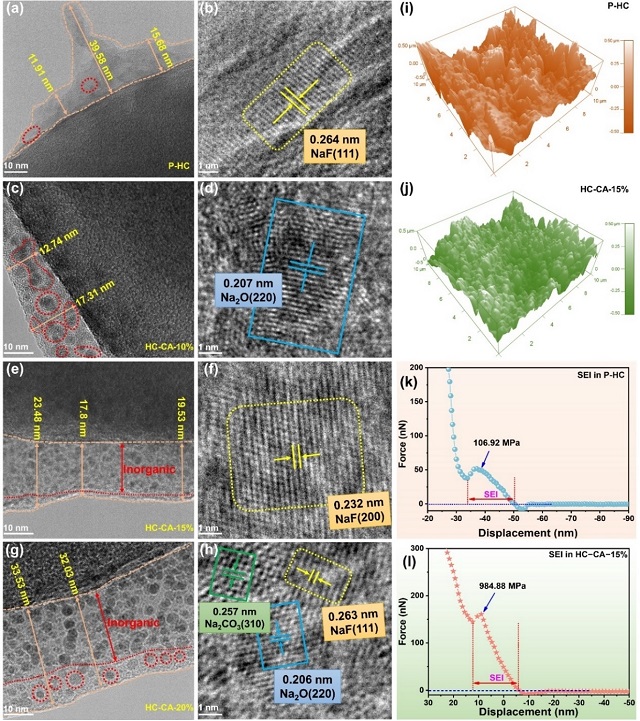 根据高倍TEM图像,经过poly-CA涂层修饰的HC-CA硬碳负极表面SEI的内部存在更明显的大范围结晶区域,SEI外部存在超薄的无定型区域,说明HC-CA负极SEI呈现无机物为主的层状结构,与醚类电解液衍生的SEI结构相类似。AFM表明HC-CA-15%负极表面SEI更平整光滑,产物分布均匀性更突出。HC-CA-15%负极SEI当中存在大量力学性能优异的NaF,有助于提升SEI的结构稳定性。