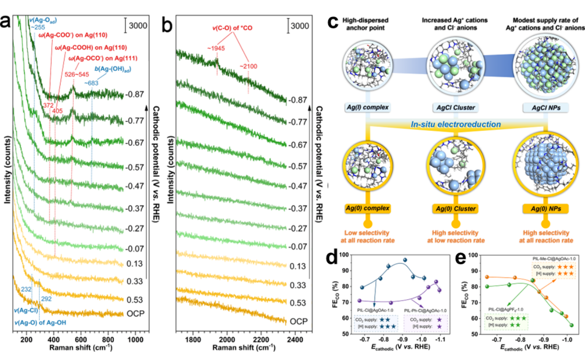 原位拉曼光谱研究发现在施加一定阴极电位后(还未发生CO2RR时),各类Ag–Cl物种便被还原为金属态的Ag(0)物种,这些Ag(0)物种被认为是发生CO2RR的实际活性表面。不同Ag–Cl物种的演化规律可被总结为:PIL提供的高度分散的锚点,即PIL的丰富螯合位点和密集静电网络,利于在引入较少Ag盐时生成Ag(I)络合物;随后,以适中速度扩散的Ag+阳离子和PIL中Cl–离子进一步反应,使Ag(I)络合物向Ag–Cl簇转化;然而,Ag–Cl纳米颗粒的形成则需要持续但缓慢的Ag+阳离子供应与相对较弱的PIL-Ag相互作用。不同杂化材料在大电流密度下的表观CO2RR活性不仅与Ag活性位点的存在形式及数量有关,还与不同PIL结构与组成导致的反应物(即CO2和H2O)的有效供给密切相关。本工作得到了国家自然科学基金委优秀青年基金项目、面上项目的资助以及化学电源与绿色催化北京市重点实验室的支持。