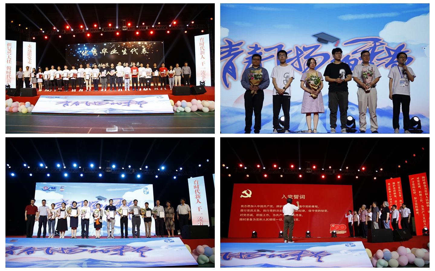 2021年是中国共产党成立100周年,晚会“初心与使命”环节,机械学院四位老党员同志和大家分享了他们的入党初心和心路历程,新入党党员代表们也分别谈了他们的感想和体悟,在老党员为新党员佩戴党徽后,由李晓雷老师带领新党员同志们在党旗下郑重宣誓。